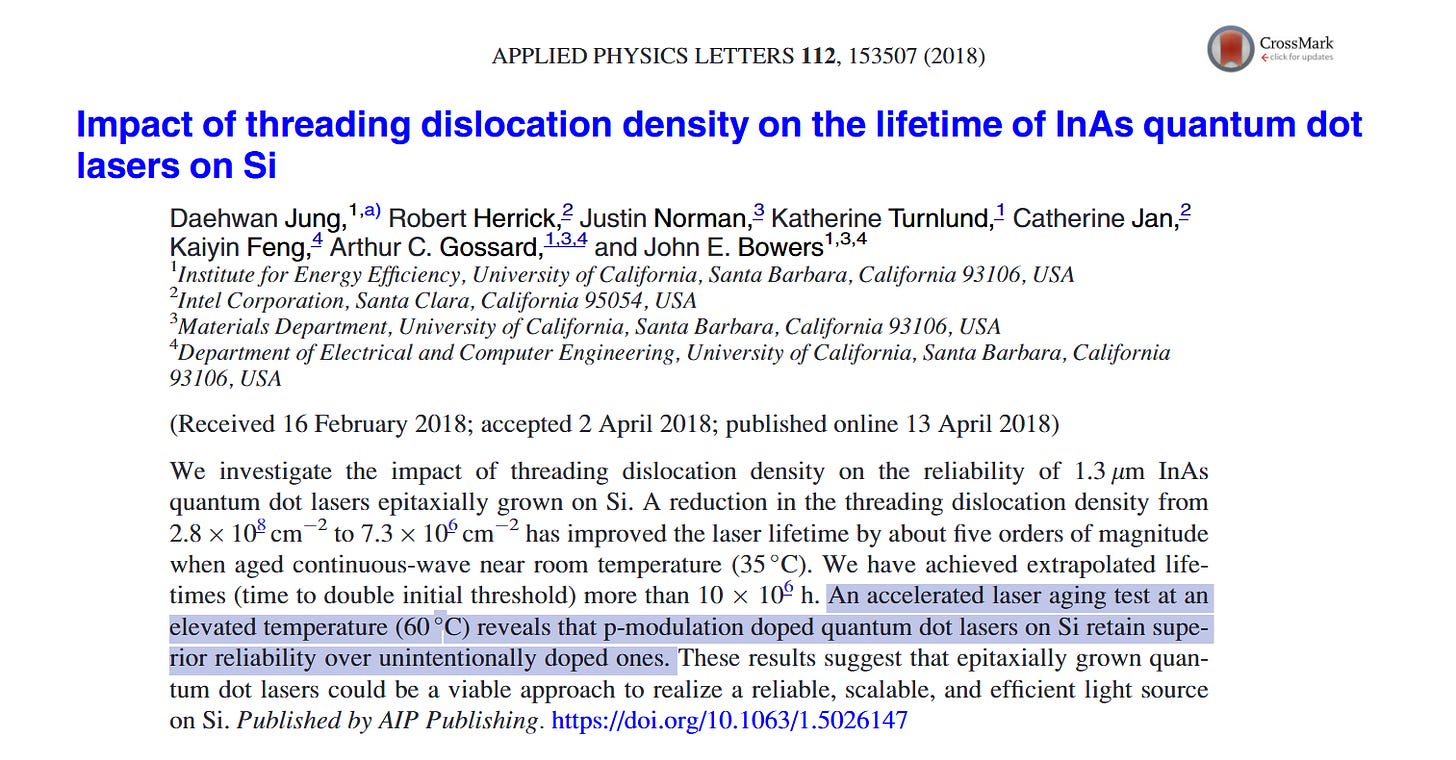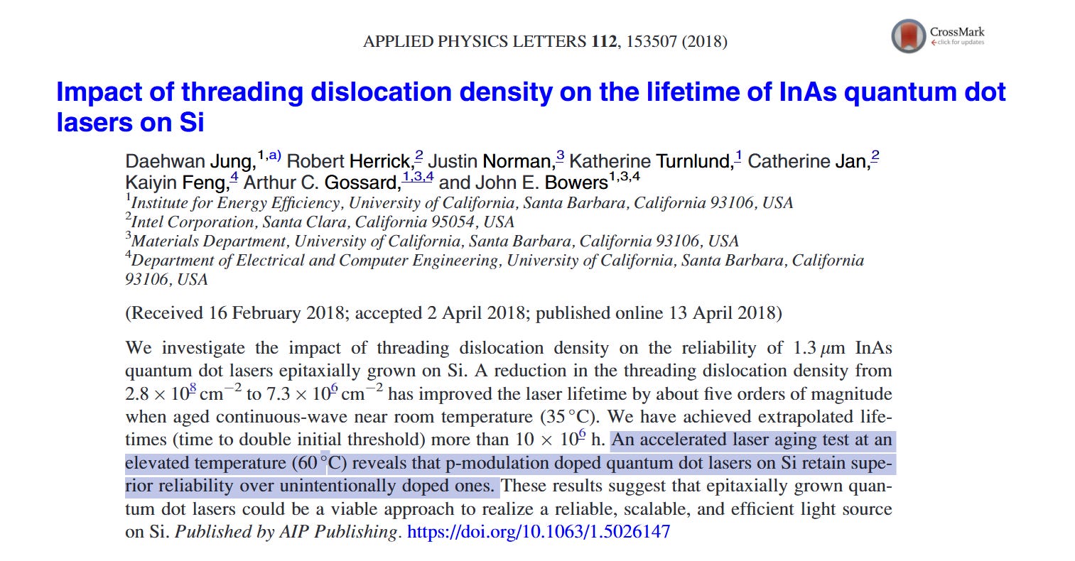 The academic center of III-V quantum dot lasers on silicon is John Bowers’ lab at UC Santa Barbara. Bowers demonstrated the world’s first hybrid silicon laser with Intel in the mid-2000s [3] and has authored most of the foundational papers in this field.