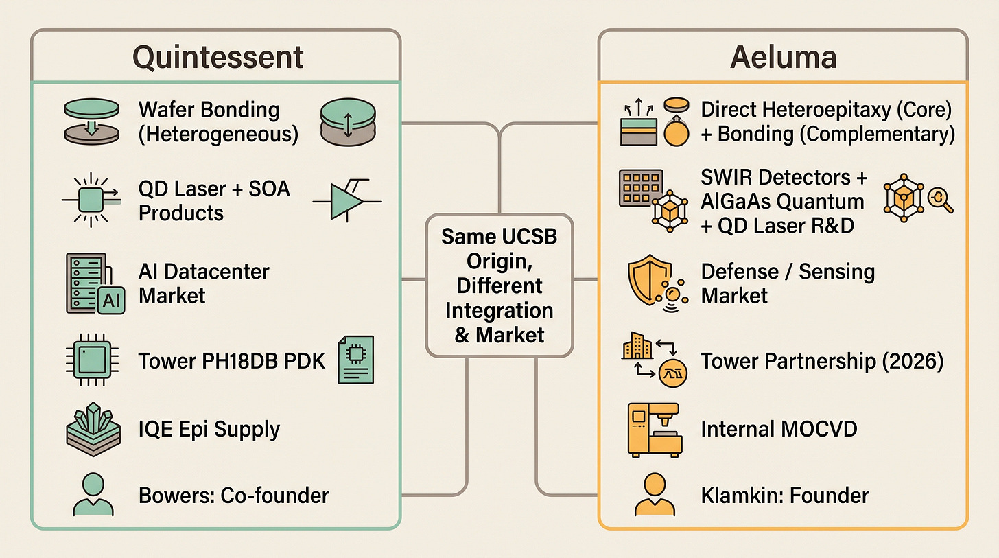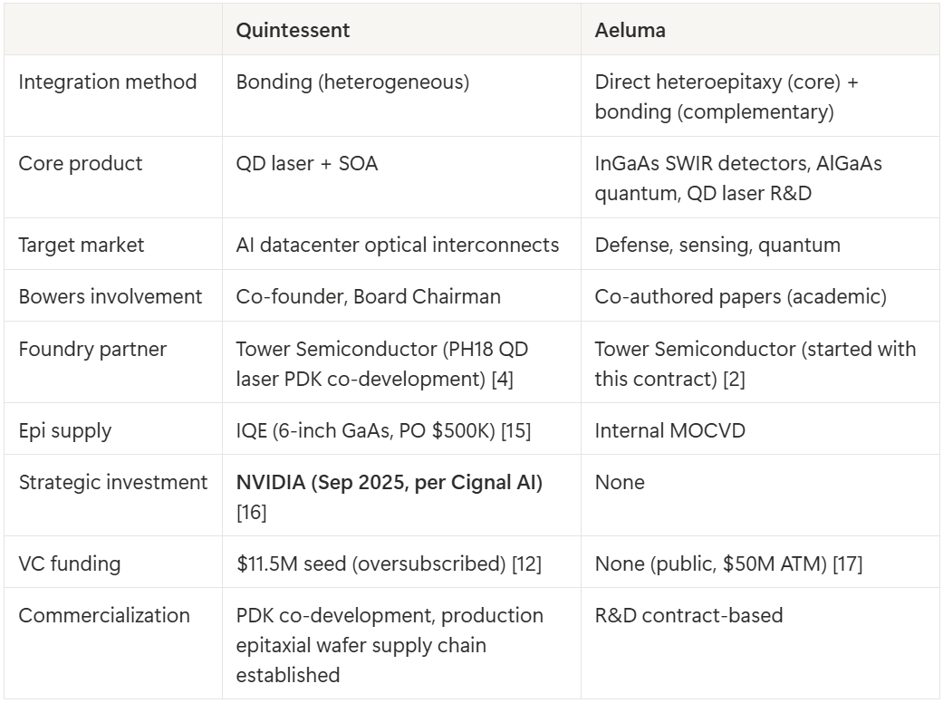 This is why the Bowers signal matters. Bowers chose to commercialize QD lasers for AI datacenters through Quintessent, using bonding. Aeluma’s direct heteroepitaxy approach is technically more ambitious, but Quintessent’s product-market story is cleaner and more immediately underwritable.