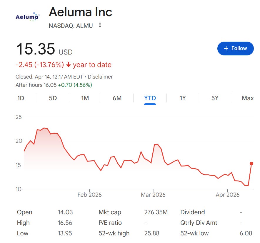 Aeluma (NASDAQ: ALMU) announced $4M in U.S. government contracts on April 13, and shares jumped over 40% intraday [2]. The contracts fund the scaling of quantum dot lasers and AlGaAs nonlinear photonics, with wafer production handled by Tower Semiconductor and Sumitomo Chemical Advanced Technology [2]. One thing to note upfront: the company’s own press release describes this as scaling its “heterogeneous integration platform,” not as a monolithic laser commercialization milestone.