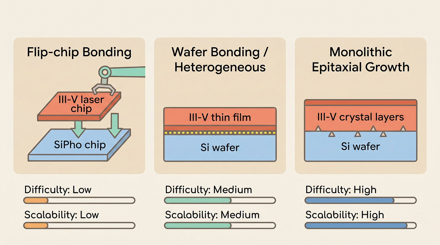 Method 1: Flip-chip bonding. Build the III-V laser separately, then pick and place it onto the SiPho chip. Think of it like snapping Lego bricks together. Most commercial transceivers use this today. It works, but each chip needs individual alignment. Cost and yield hit ceilings.