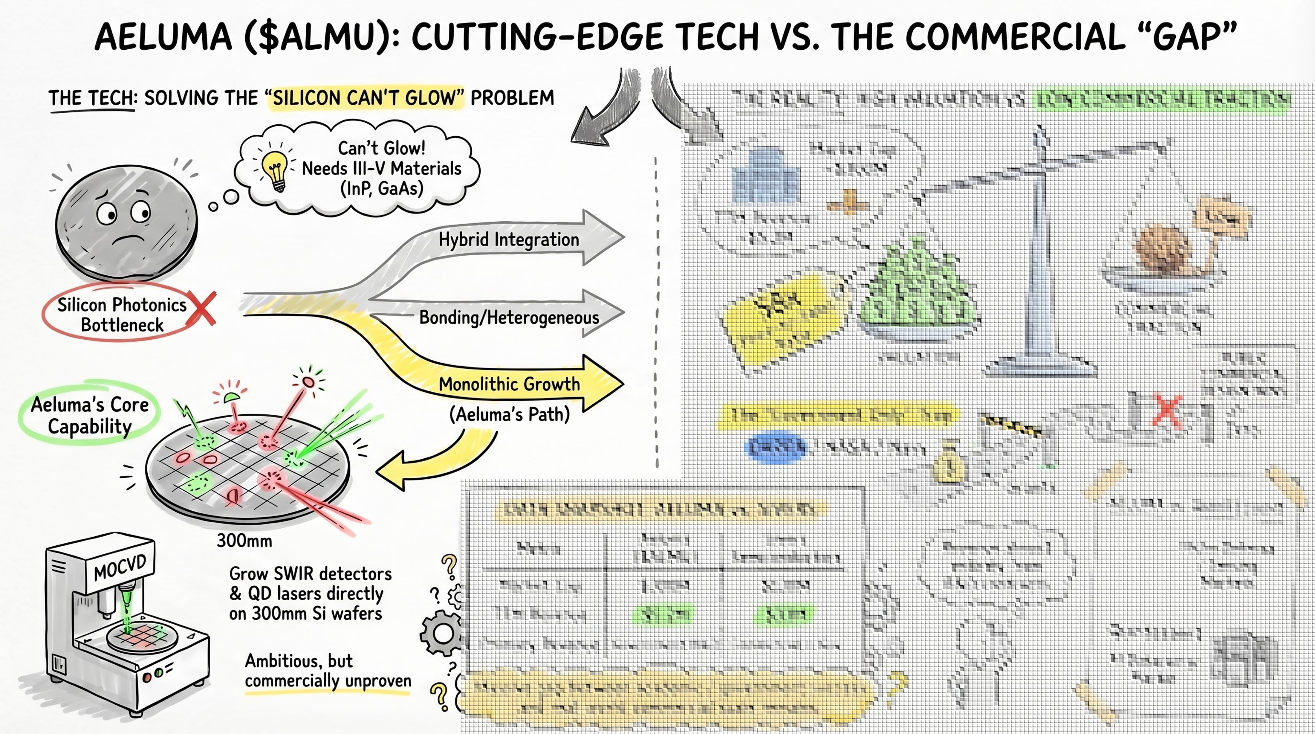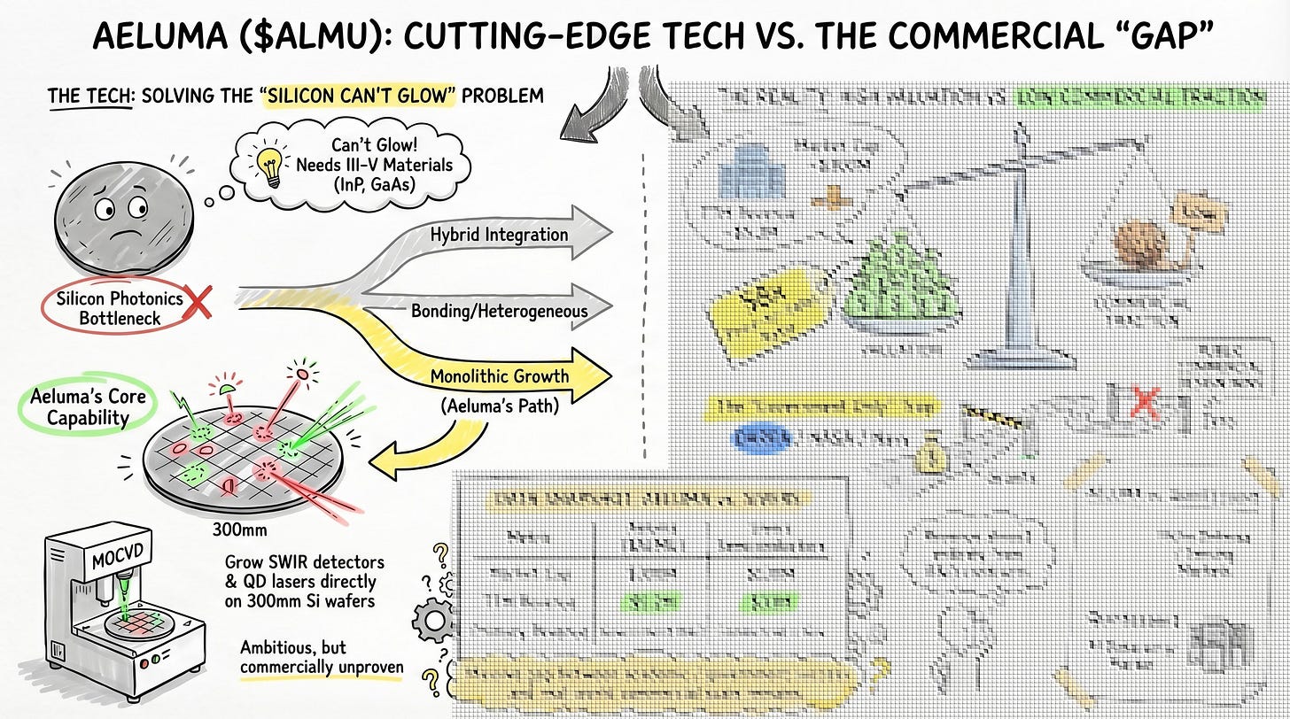 A $5M-revenue company is trading at a $300M market cap. Aeluma (NASDAQ: ALMU) is developing a III-V-on-silicon platform centered on direct heteroepitaxy via MOCVD, with complementary wafer bonding work. On April 13, the company announced $4M in U.S. government contracts alongside manufacturing partnerships with Tower Semiconductor and Sumitomo Chemical, sending shares up over 40% intraday [2]. This article, a follow-up to our earlier comparison of three SiPho light source microcaps [1], is a standalone deep dive into Aeluma’s technology platform, its competitive positioning against Quintessent (which uses a different integration approach and targets a different market), and the valuation gap between government R&D validation and commercial reality. The technology is real. The commercial proof is not.