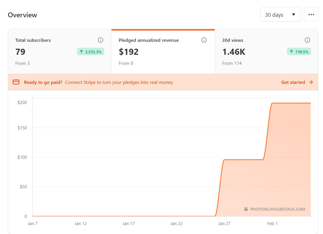 Today, a notification led me back to find a significant spike in both subscribers and “Pledged Annualized Revenue” around late January.