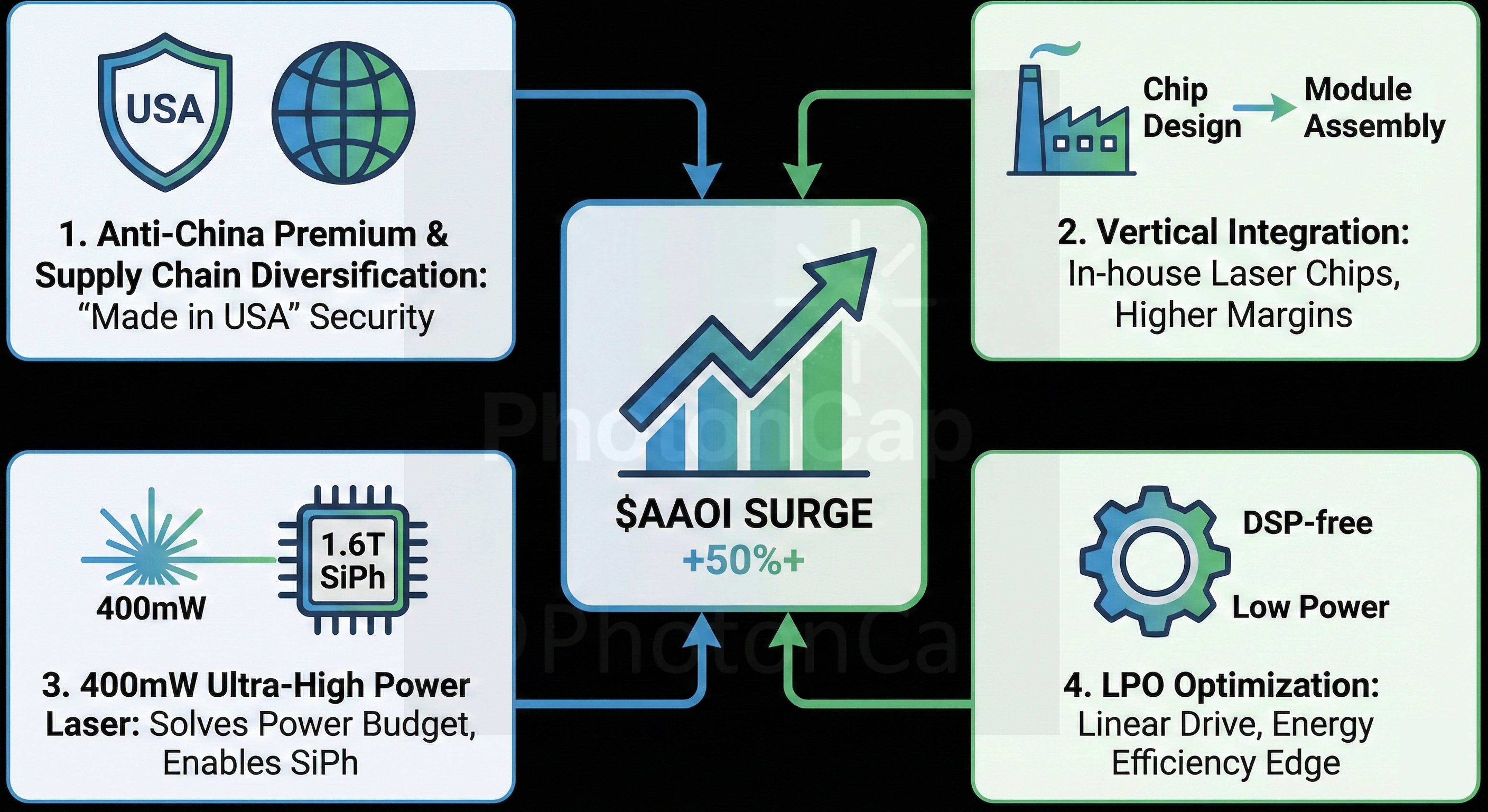 As the industry moves toward power-efficient, DSP-less LPO (Linear Drive Pluggable Optics), the laser chip itself must be exceptionally “clean” and linear. Because $AAOI owns its chip design, they can natively optimize the laser’s linearity for LPO configurations, giving them a massive time-to-market and performance edge over competitors using off-the-shelf components.