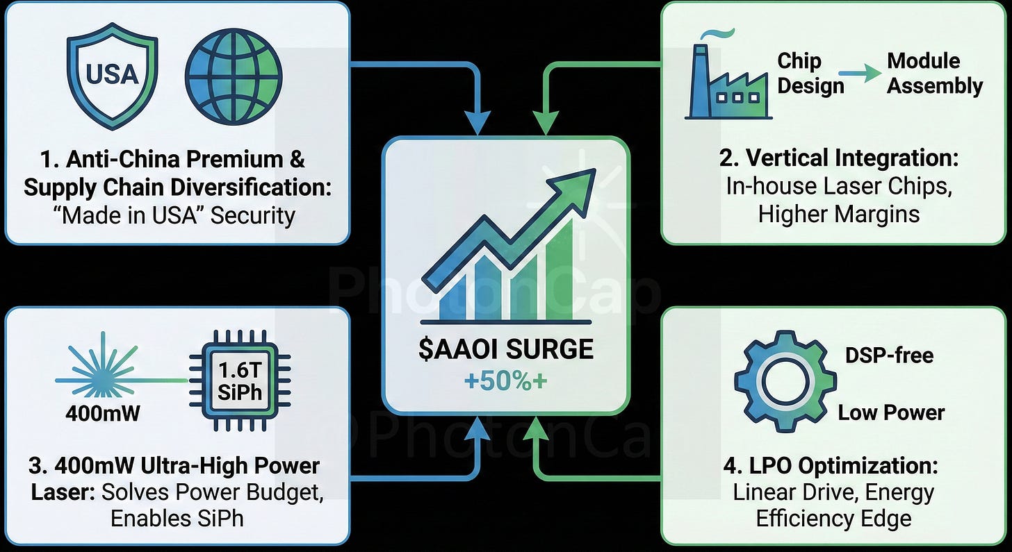 Bottom Line: $AAOI isn’t trying to out-scale Innolight; they are filling the exact void hyperscalers desperately need—a reliable, US-based, vertically integrated supplier providing the “fuel” (external lasers) for the next generation of AI networks.