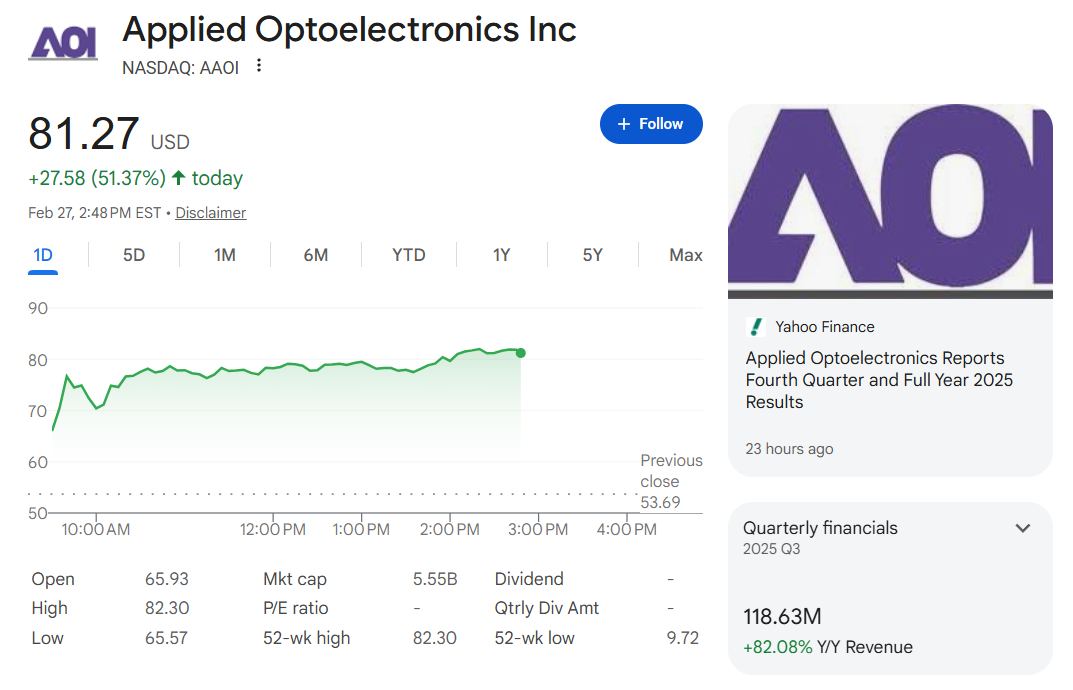 The massive rally in AAOI 0.00%↑ isn’t just a thematic pump—it’s a structural re-rating driven by the 800G/1.6T AI boom, geopolitical shifts, and a deep technological moat. Here is a breakdown of why $AAOI is dominating right now: