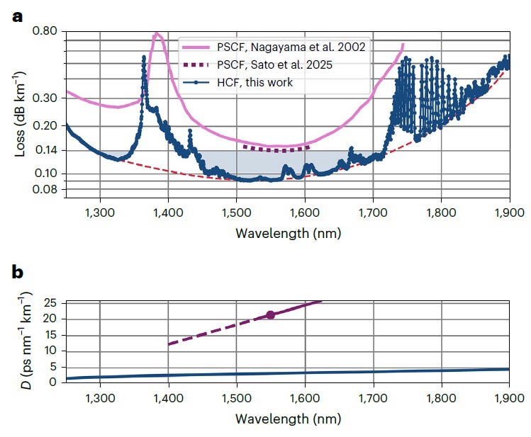 Below is a graph comparing it to conventional fiber. HCF (blue) has lower loss and lower dispersion (D) compared to conventional pure silica core fiber (PCF, pink).