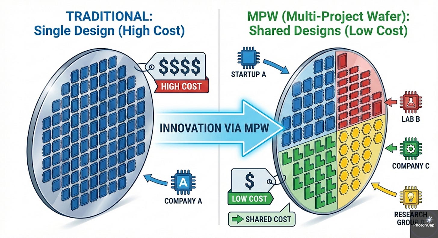 Concept: Like ‘Carpooling,’ it is a method where designs from multiple companies are loaded onto sections of a single wafer.