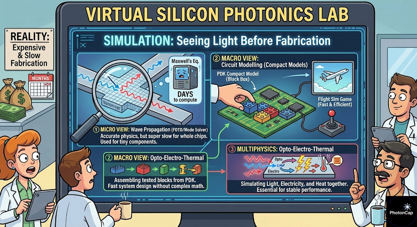 Lukas Chrostowski emphasizes in his book (Chapter 2) that “Silicon Photonics design is a process of integrating simulation tools of various levels.” Because fabrication is expensive and time-consuming, failing in advance within a computer is mandatory.