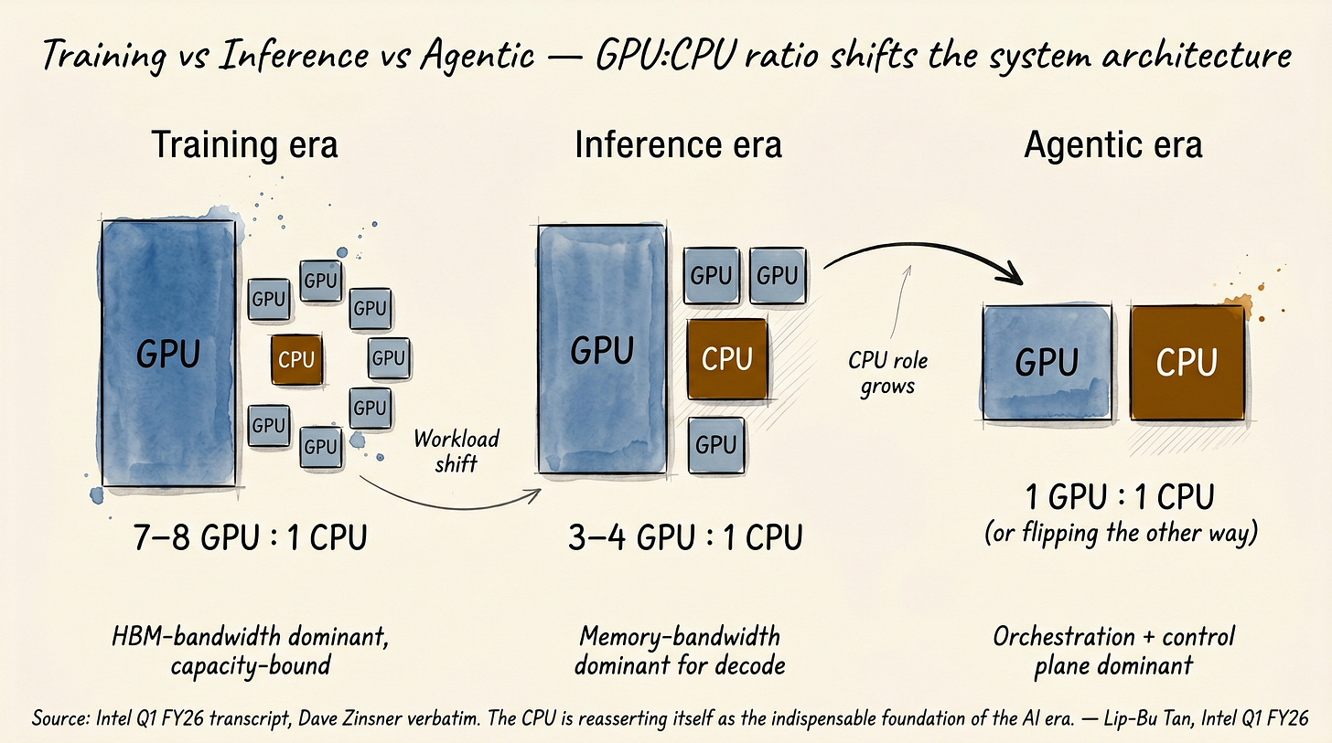 In the training era, eight GPUs share one CPU. The CPU is essentially a peripheral, a feeding mechanism for the GPU cluster. In the inference era, the ratio is three to four to one. The CPU role is roughly doubling. In the agentic era, the ratio is potentially inverting, more CPU than GPU. The CPU is no longer a peripheral. It is the orchestration layer.