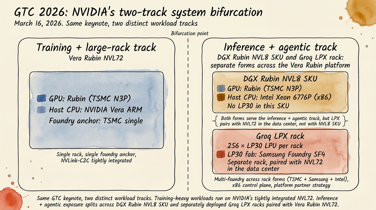 These are the same Rubin generation chips at the GPU layer. NVL72 and DGX Rubin NVL8 share the Rubin GPU layer, while LPX adds a separate LPU-based inference rack paired with Vera Rubin NVL72. But everything else (host CPU, accelerator companion, foundry mix) is distributed across the platform. This is what GTC 2026 made visible. Workloads bifurcated, system designs bifurcated, supply chains bifurcated.