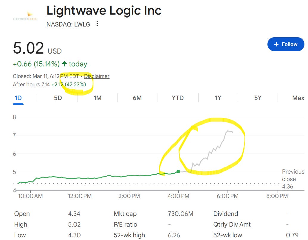 The market had already spoken before the formal announcement. LWLG rose +15.14% (+$0.66) during the regular session, and the official press release came right after the close (4:30 PM ET) [1]. In extended-hours trading, the stock hit a high of $7.28 (roughly +67% from the previous close of ~$4.36). The stock moving before the announcement suggests the market was already sensing and front-running the deal.