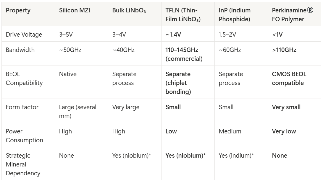 Third, no critical mineral dependency. LWLG markets Perkinamine® as “rare-earth-free” [12]. Strictly speaking, the competing materials’ niobium (LiNbO₃) and indium (InP) are not rare earths but critical minerals — yet both carry significant China supply chain exposure. Perkinamine®’s organic polymer structure avoids these dependencies entirely, providing a geopolitical risk hedge.