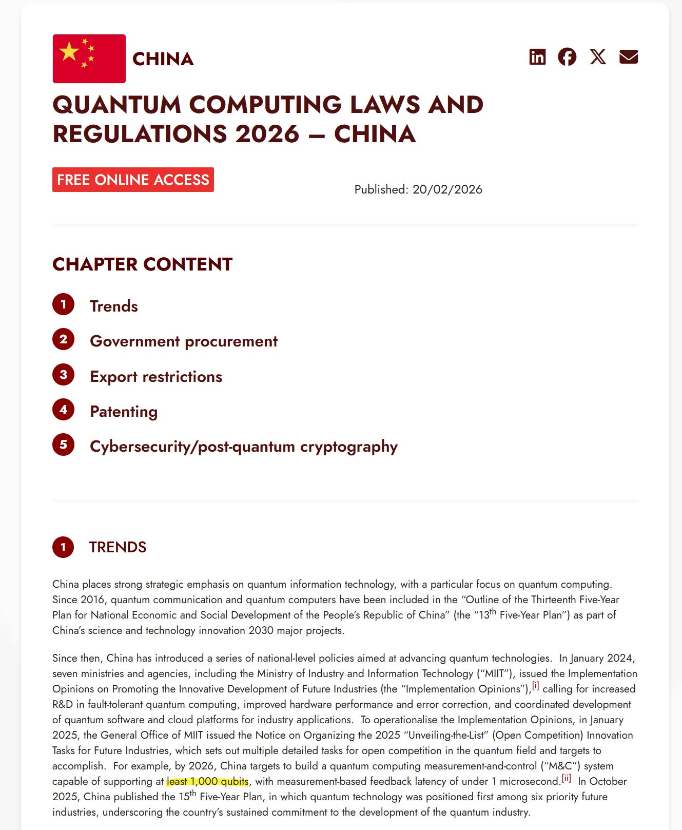 In January 2025, the Ministry of Industry and Information Technology (MIIT) issued open-competition tasks for the quantum sector, including a target to build quantum measurement and control systems capable of supporting at least 1,000 qubits, with measurement-based feedback latency of under 1 microsecond, by 2026.[25]