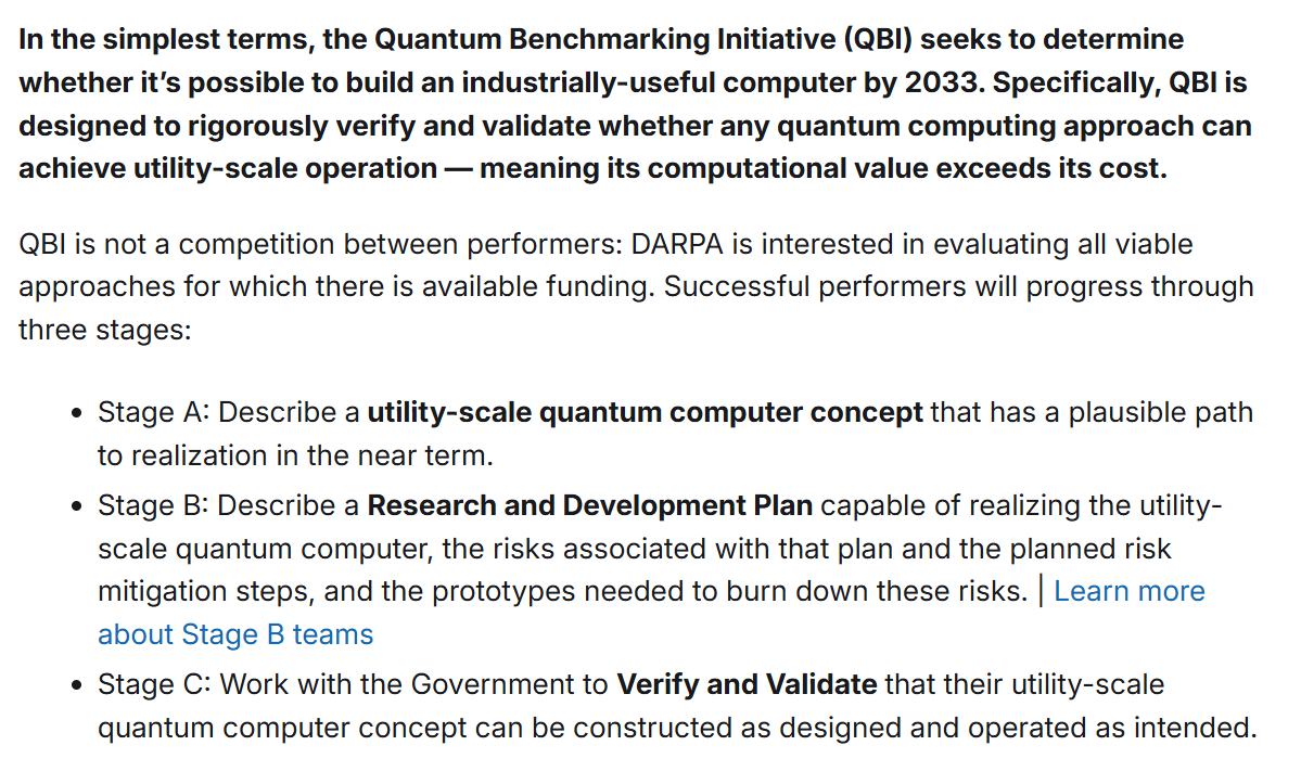DARPA’s QBI (Quantum Benchmarking Initiative) asks a blunt question. Regardless of quantum computing approach, can a utility-scale quantum computer, one whose computational value exceeds its cost, be built by 2033?[12]