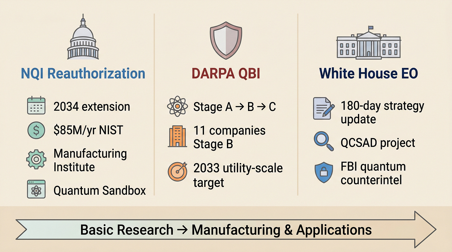 The US quantum strategy rests on three pillars: NQI Reauthorization in Congress, DARPA’s QBI benchmarking program, and a White House executive order draft. Each operates on a different timeline and targets a different objective.