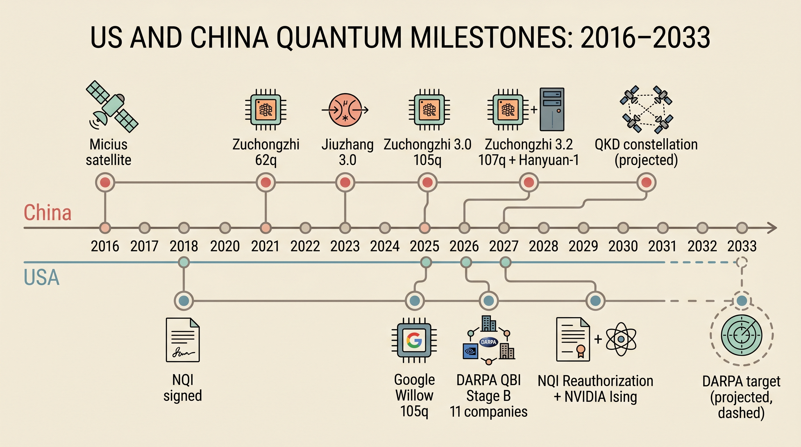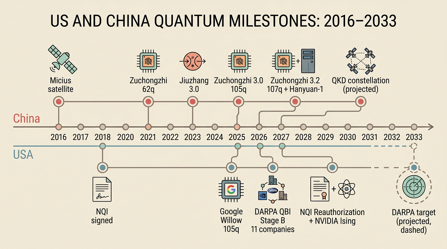 In a previous article, we analyzed Google Quantum AI’s cryptocurrency quantum vulnerability whitepaper.[3] This article extends that work, zooming out from individual companies to the national-level strategic competition. On the US side, we cover three pillars: NQI, DARPA QBI, and the White House executive order draft. On the China side, we trace the technology arc from Micius to Zuchongzhi 3.2 and the 15th Five-Year Plan. The thesis of this piece is that the real winner of this national competition does not live at the hardware layer.