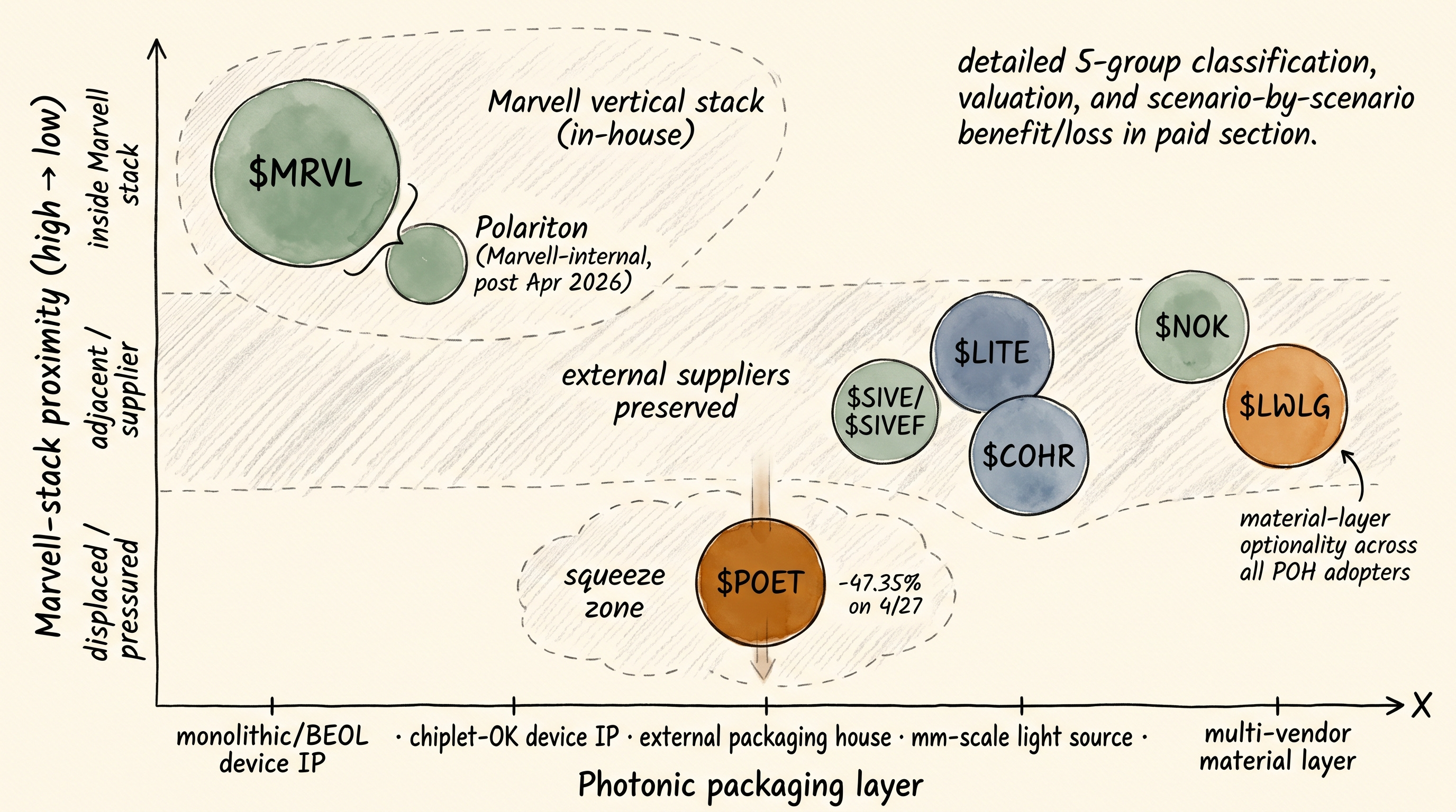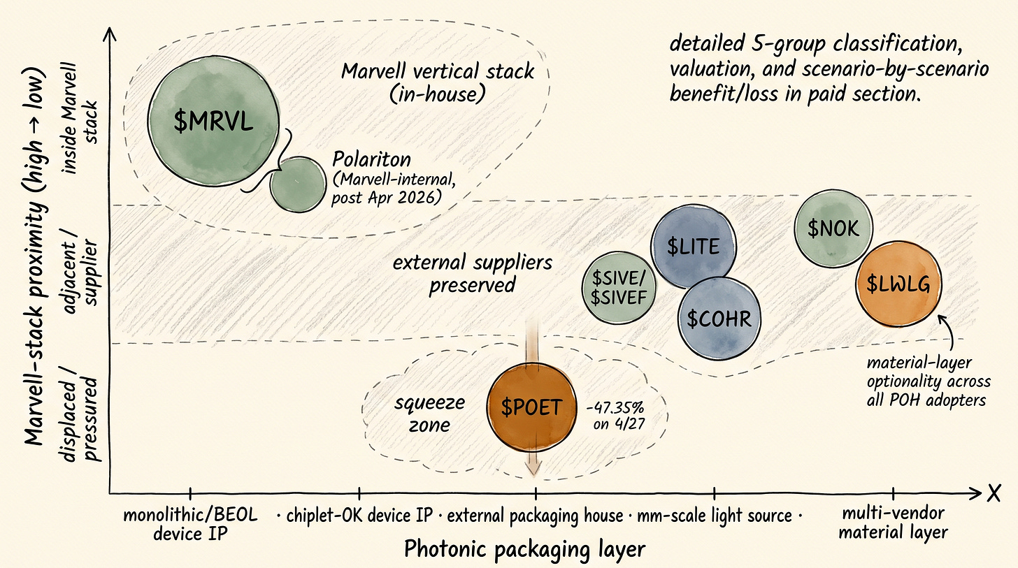 The real divide starts here. The seven tickers (POET, SIVE, LITE, COHR, MRVL, NOK, LWLG), plus Polariton as a Marvell-internal asset, all sit on the same event, but they split into four distinct groups: the company already pushed out of the packaging layer, the company on a different layer that escapes the pressure, the company carrying multi-OEM material optionality, and the company that sits on both ends of the two acquisitions. Their risk/reward profiles diverge sharply.