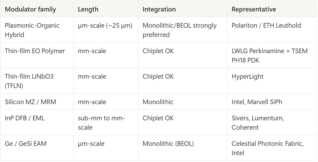 When the modulator is millimeter scale, the bonding interface loss is tolerable. LWLG and TFLN families have die-level heterogeneous integration as a viable production path. POET should have aimed at the thin-film EO polymer slot, but its InP DBR plus interposer model is modulator material agnostic, so it never locked into any single material camp.