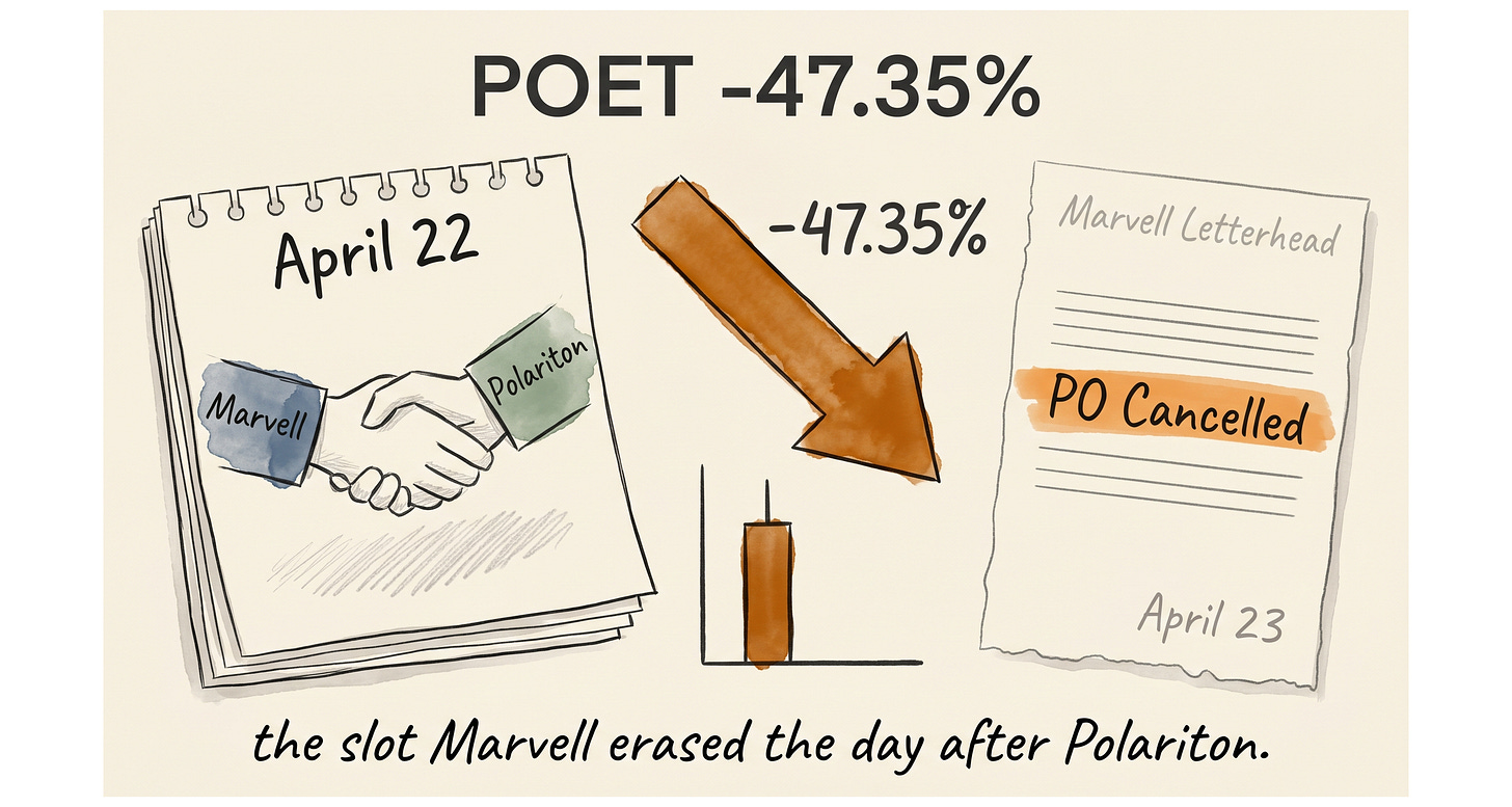 POET dropped 47.35 percent on April 27. The surface reason is an NDA breach, but the real question this piece raises is different. Why did Marvell, the day after announcing the Polariton acquisition, claw back every purchase order POET had received from Celestial AI in a single stroke? And why did the cancellation reach all the way back to the initial production order first disclosed on April 25, 2023? Pure retaliation would only have required cutting the recent batch. The 24-hour gap and the three-year-deep PO recall together look closer to a layer-cleanup signature.