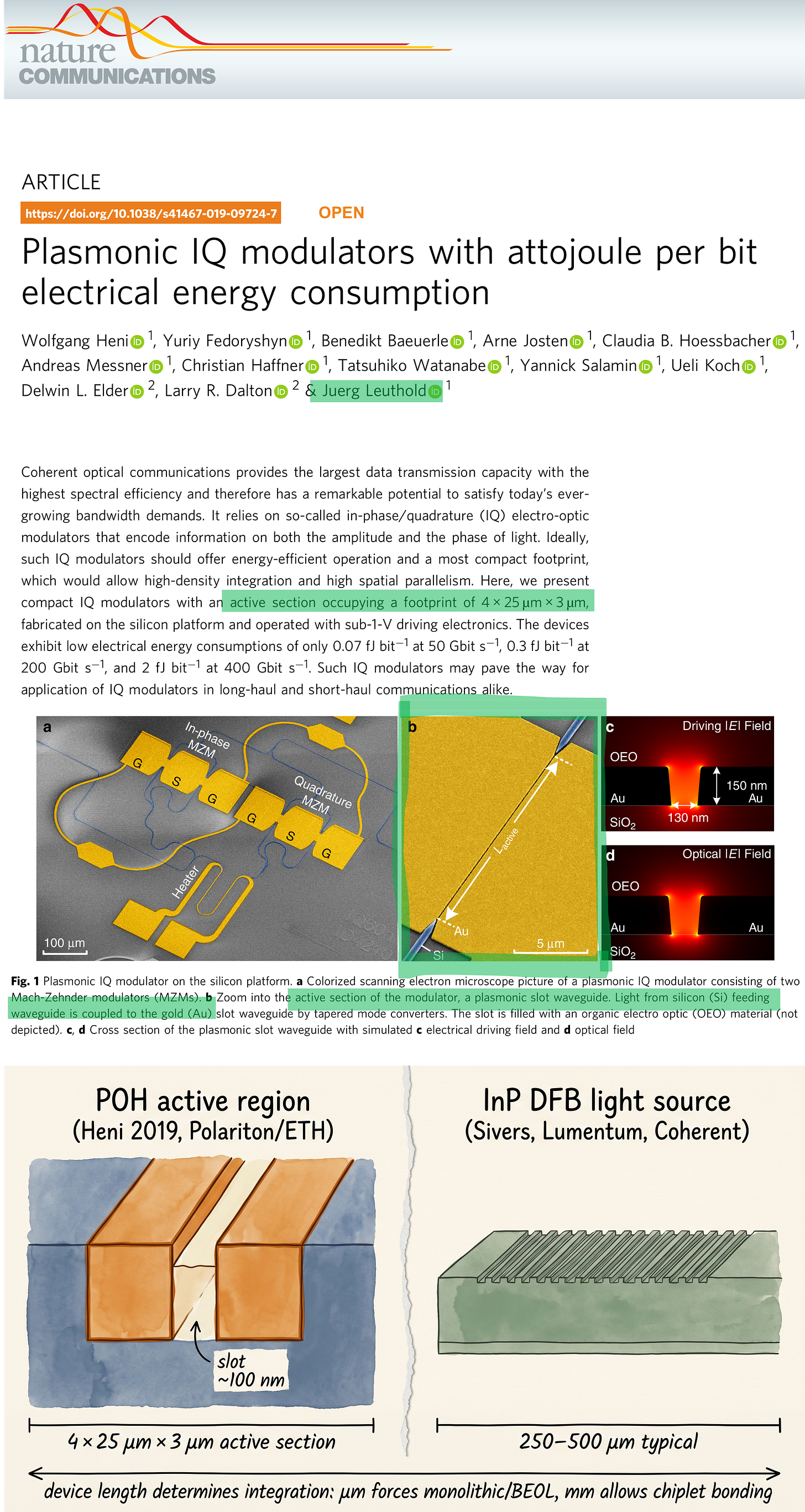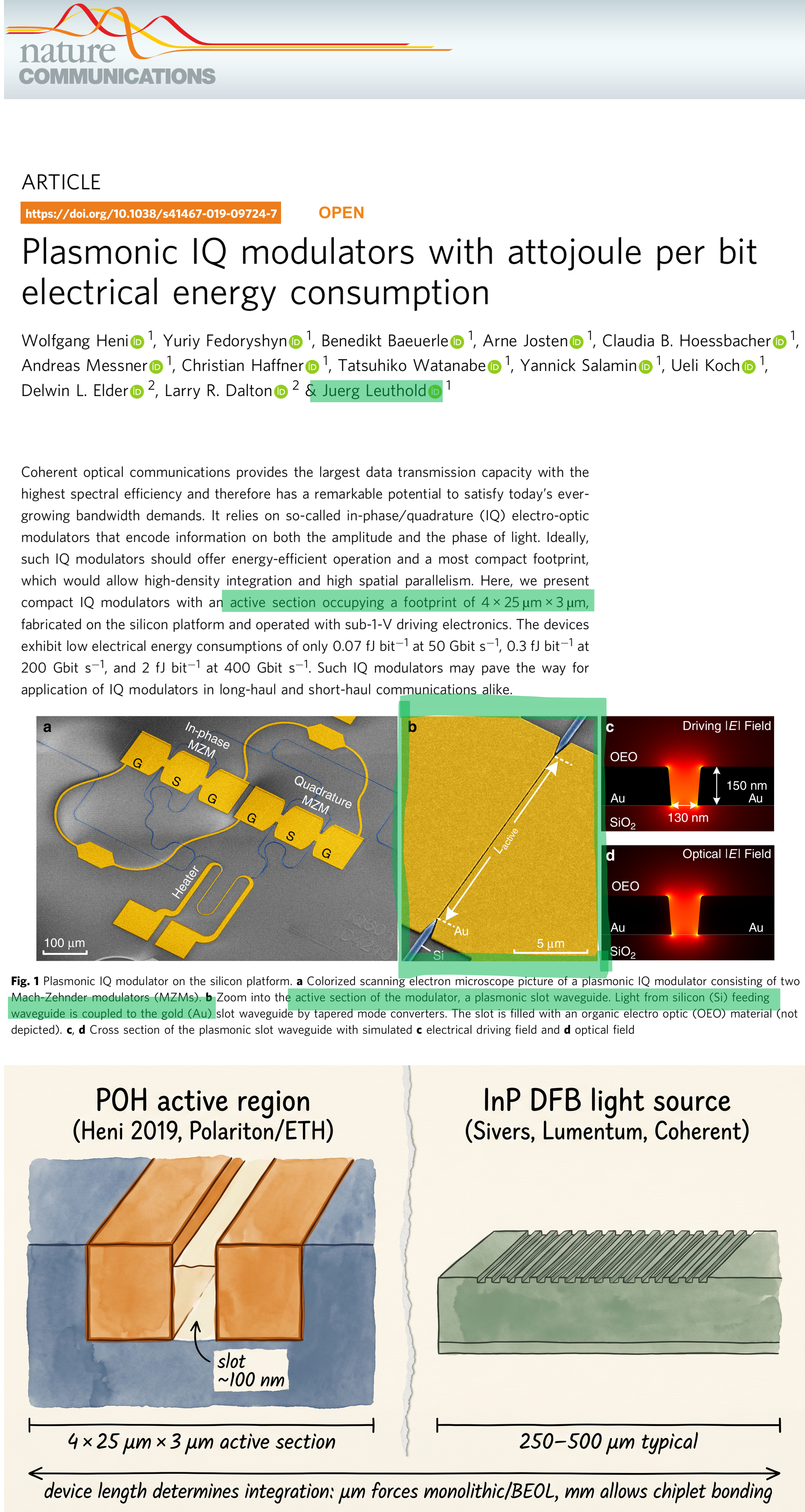 This architecture is the result of fifteen years of continuous work in the Leuthold group: plasmonic absorption modulator at KIT in 2011 (Optics Express), the 2014 Nature Photonics phase modulator at ETH, the 2015 Nature Photonics all-plasmonic MZM, the 2018 Nature low-loss plasmon-assisted modulator, the 2019 Nature Communications IQ modulator, and the 2025 Optica 1 THz result.[13][14][15][17][19]