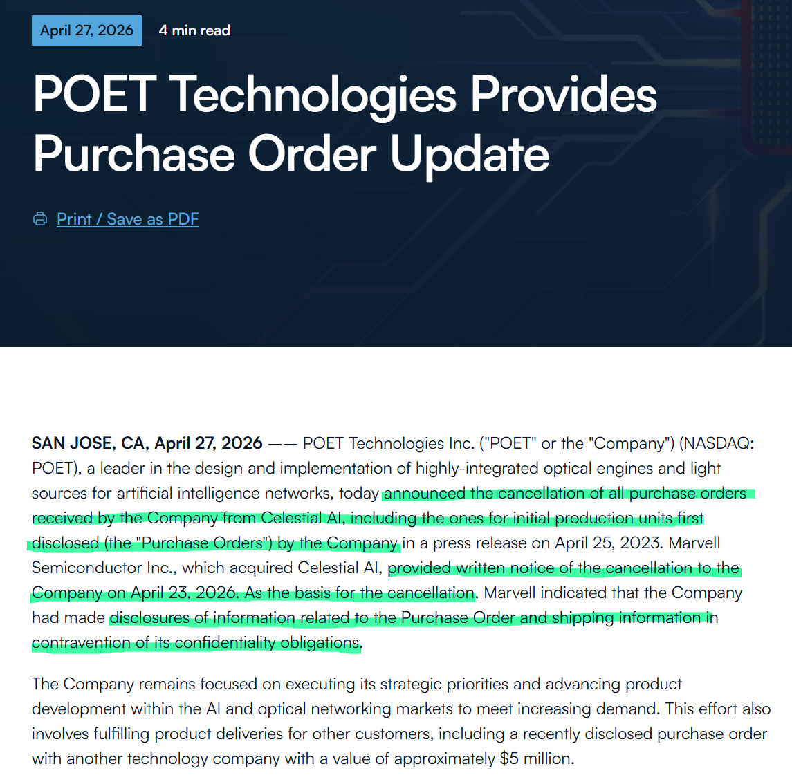 • 2026.4.23: Marvell sends written notice canceling every purchase order POET had received from Celestial AI [1]